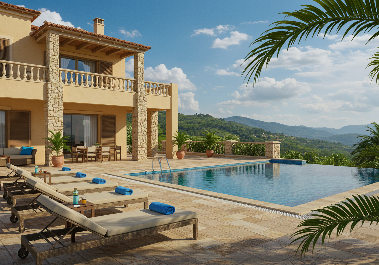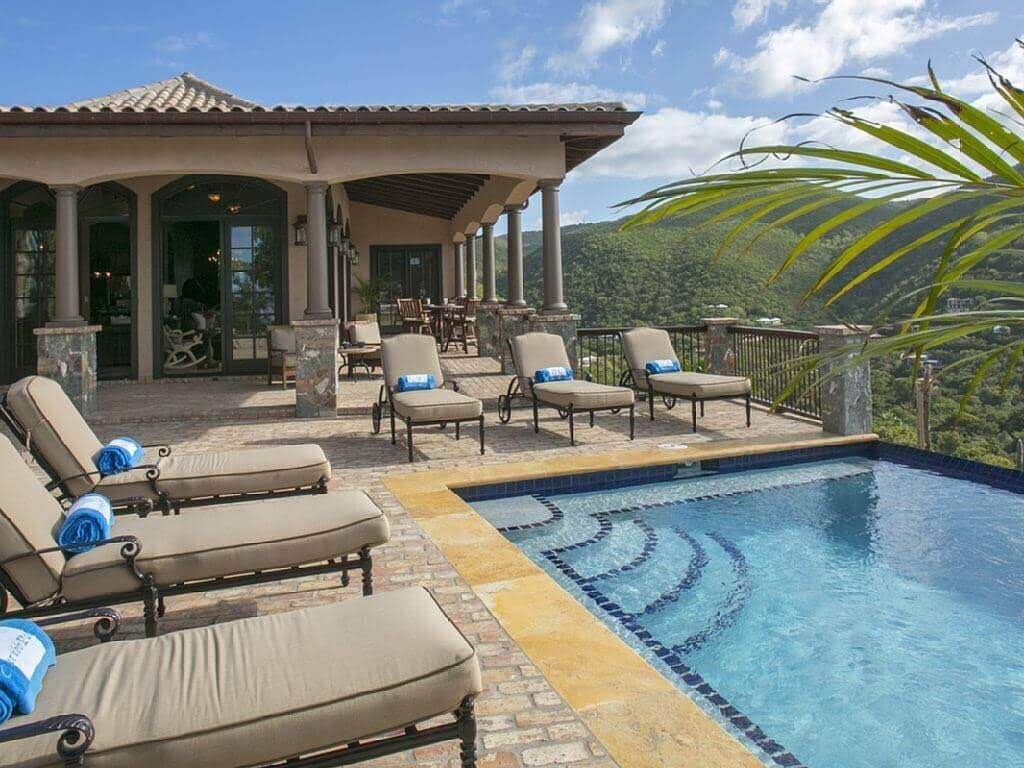 Caribbean Palm Villa is a brand new Pool Villa with spectacular 270-degree views conveniently located just five minutes from downtown Cruz Bay. The decor of the villa is an elegant yet rustic theme which would mimic a Mediterranian/Tuscan villa that has met the Caribbean. All rooms, including bedrooms, are accessed by an interior staircase which is much safer for guests with small children. There are cots available for additional guests. -The first floor has 1 of the 3 master suites, a kitchen, a great room, laundry and a powder bath. The villa offers WiFi, satellite TV, a fully integrated audio system with indoor & outdoor speakers, beach chairs, coolers and purified water throughout the villa. Three equal-sized master bedrooms each with AC and king beds will guarantee that each guest has a wonderful room – all with bay and ocean views. Each master suite has a private balcony, satellite television and ceiling fans. Imagine taking a shower with the trade winds blowing on you with an ocean view. Outdoors, Caribbean Palm Villa is professionally landscaped with multiple natural stone outcroppings with native cactus mixed in to add to the appeal of this villa. Beyond the tremendous rock outcroppings is beautiful Fish Bay and the Caribbean Sea beyond. Caribbean Palm Villa also features native stone walls throughout the entrance and the veranda.
